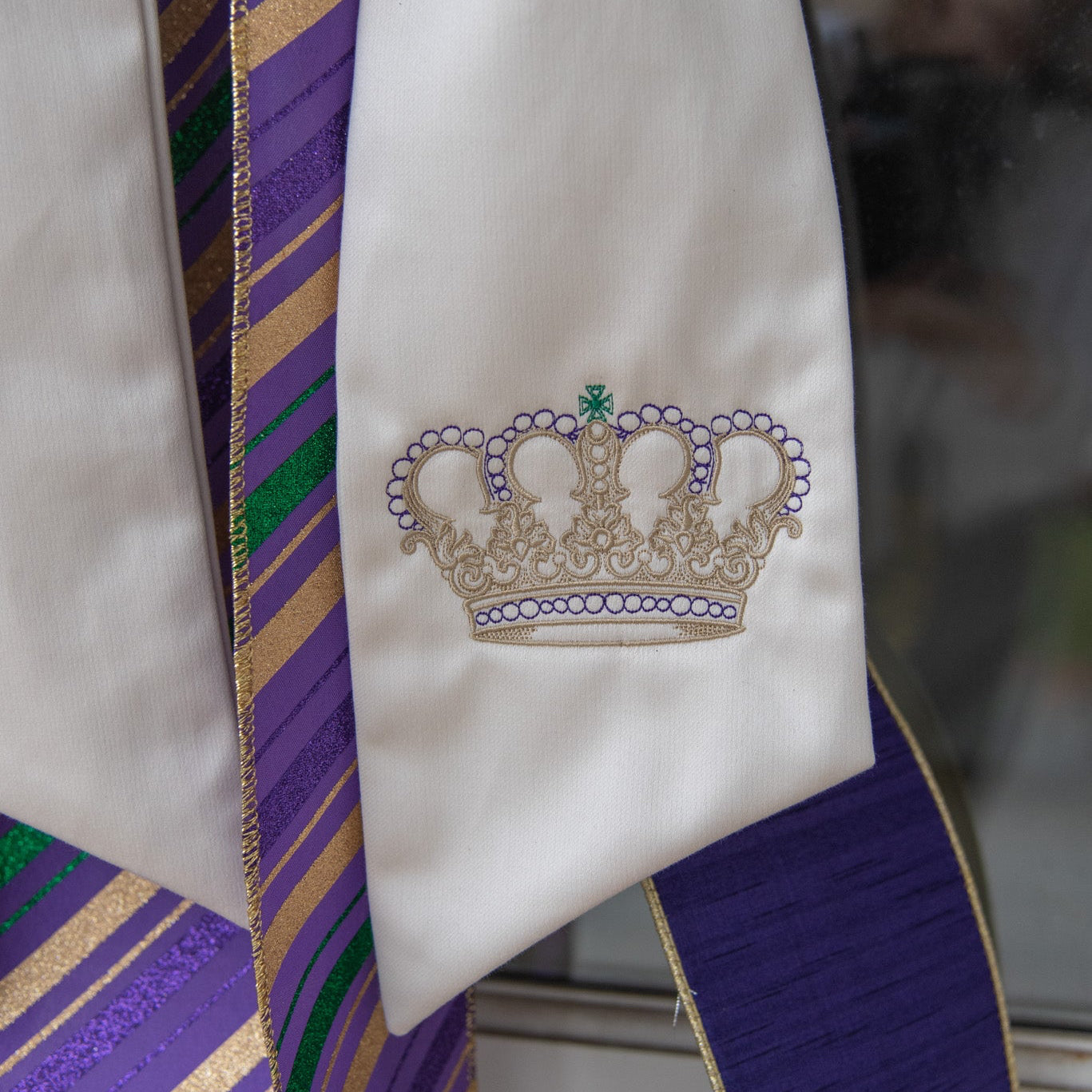 Celebrate the Carnival Season in style- now with THREE styles! We have added a King's Crown along with our festive Mardi Gras mask to our Mardi Gras Wreath Sash collection. Both Crown and Mask are embroidered in classic Mardi Gras gold, purple and green on our standard wreath sash or larger sized wreath sash. Larger Wreath Sashes are in stock now and will ship out faster than our standard wreath sashes- those have a 1-2 week lead time.
