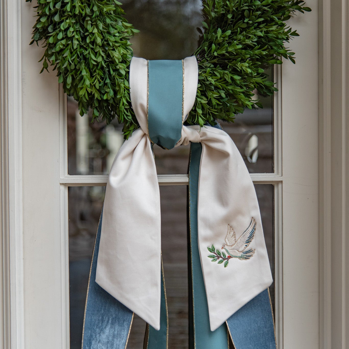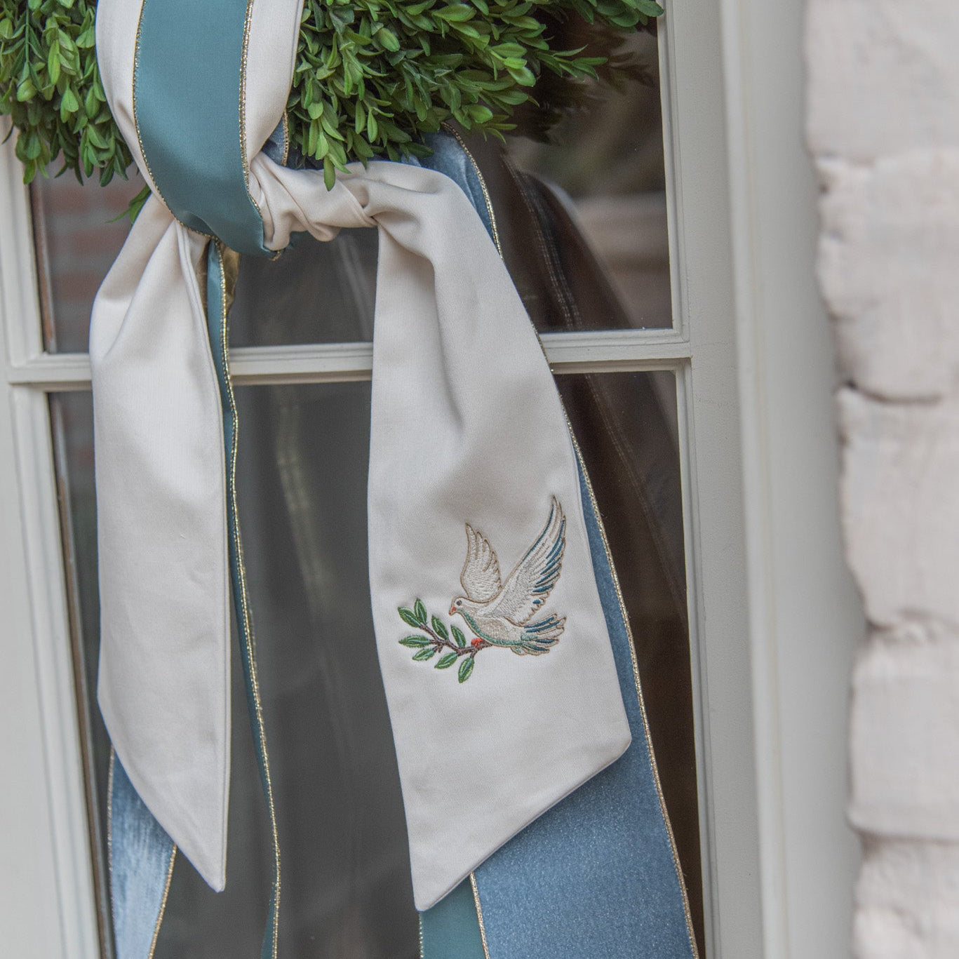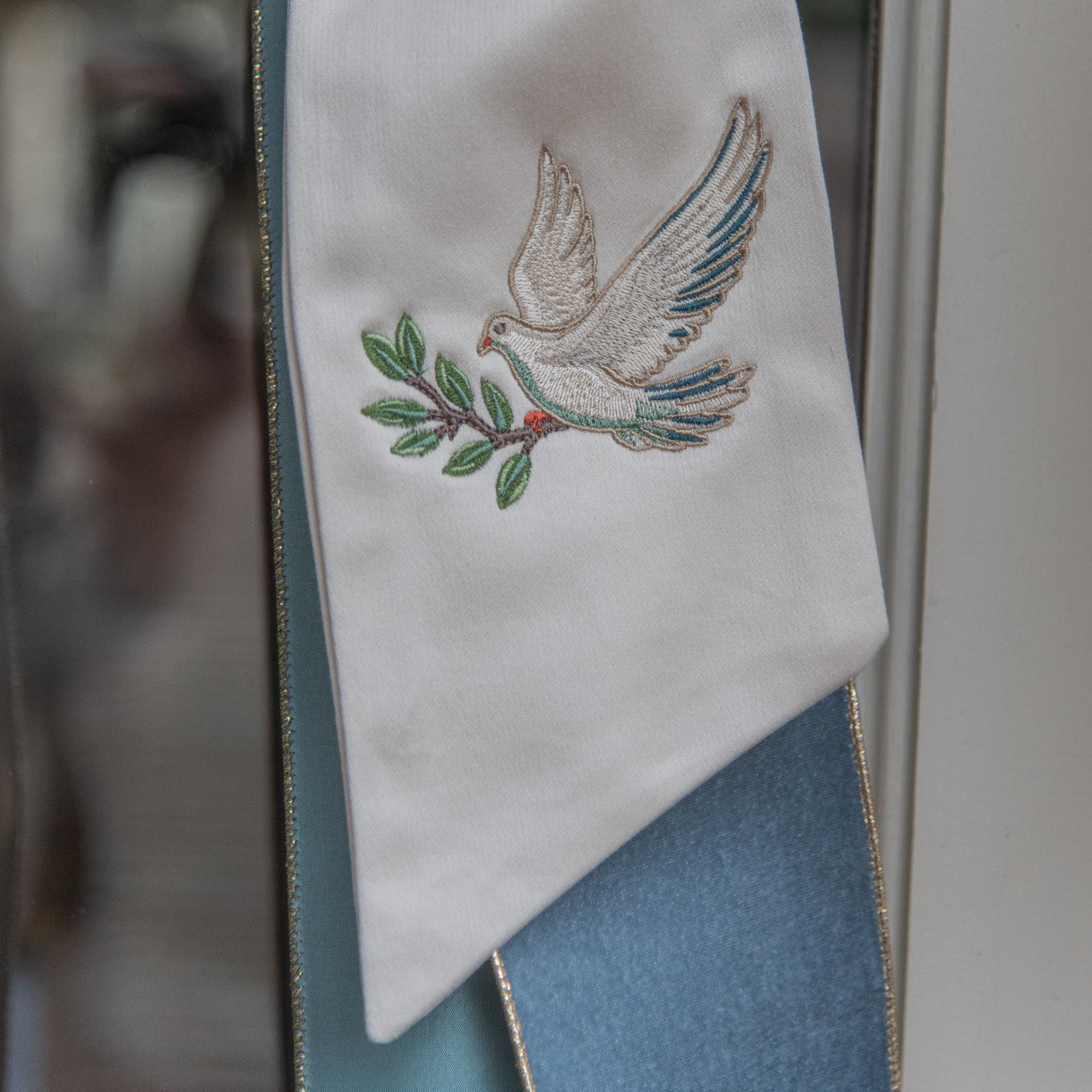 The Dove Wreath Sash features a gold embroidered dove with a green leaf on our signature ivory wreath sash. The Dove Wreath Sash is a meaningful sentiment of peace for any home.