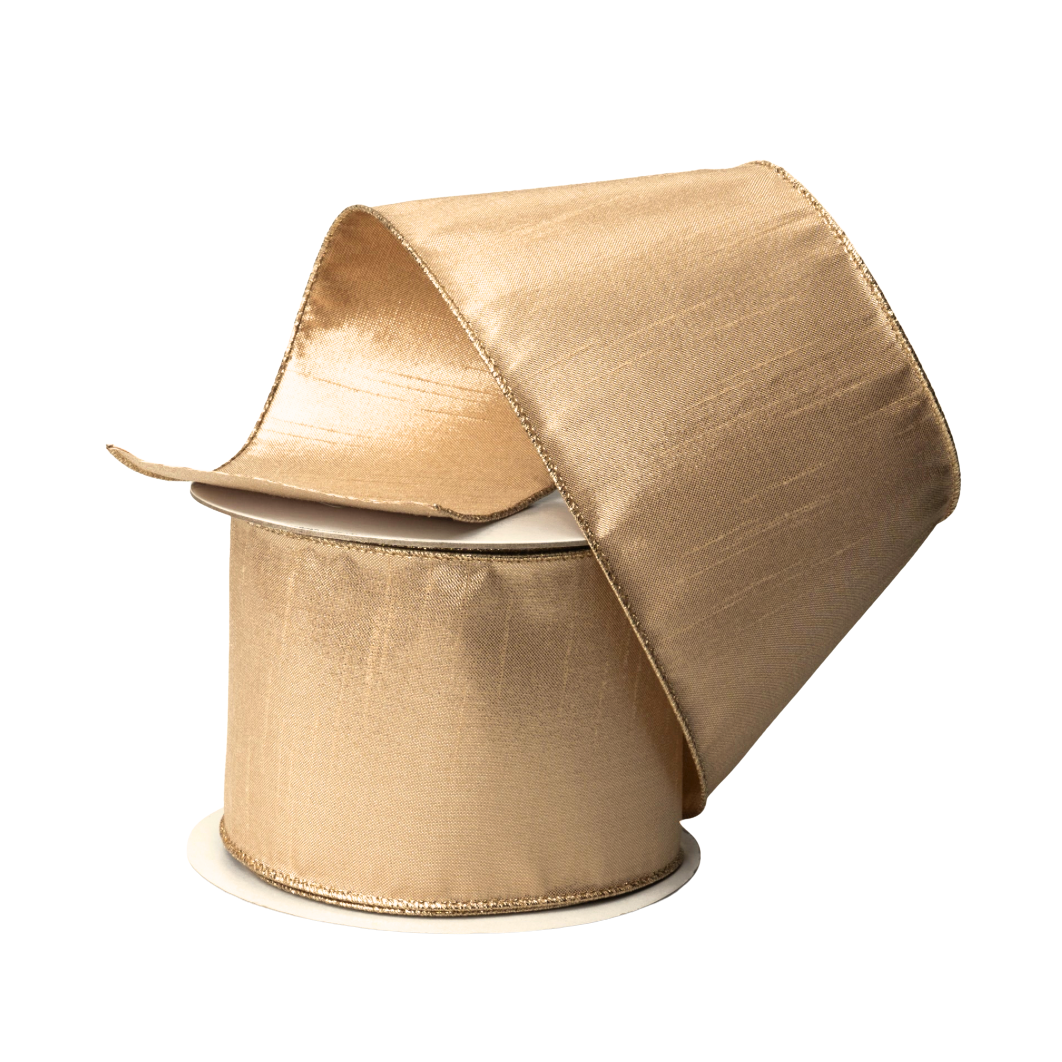 Add a classical accent to your gifts or hearth this holiday season. This gold wired-ribbon is a metallic polyester dupioni. When you style this metallic, ribbon there's no such thing as a bad side. Its luxurious metallic front and back will add a perfect touch to wreaths, greenery, gifts and more!