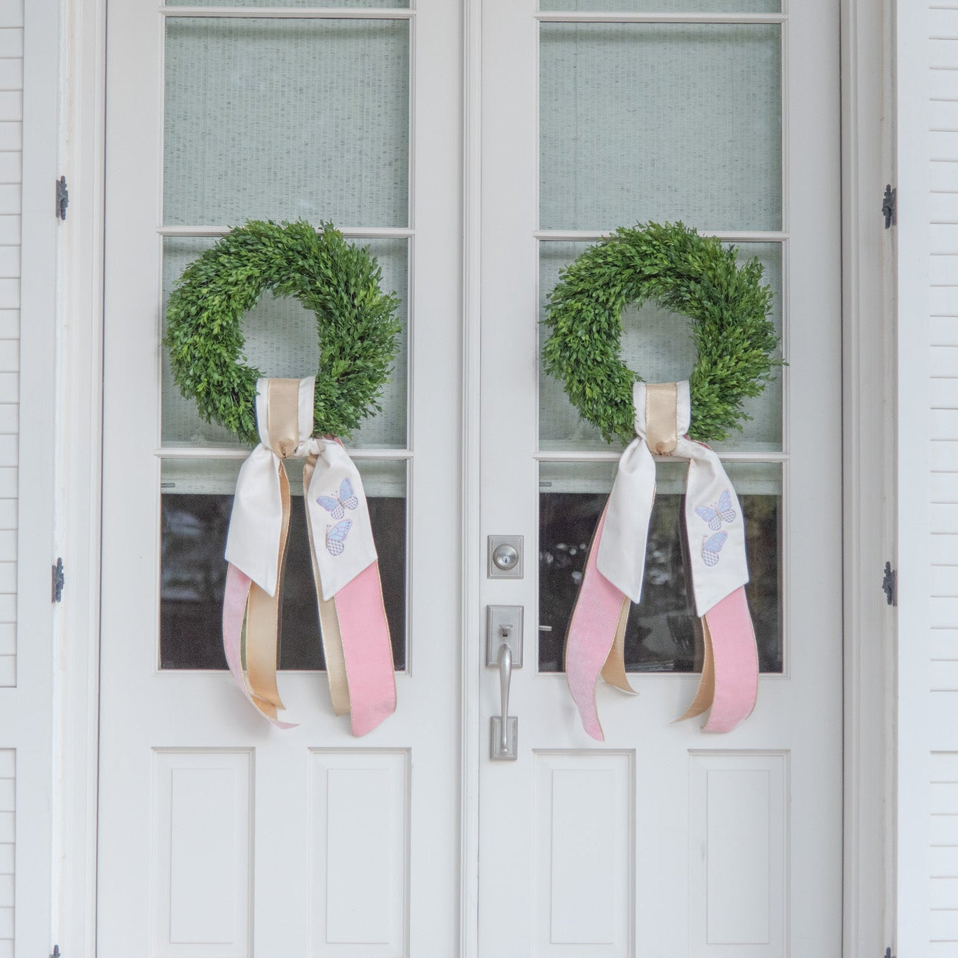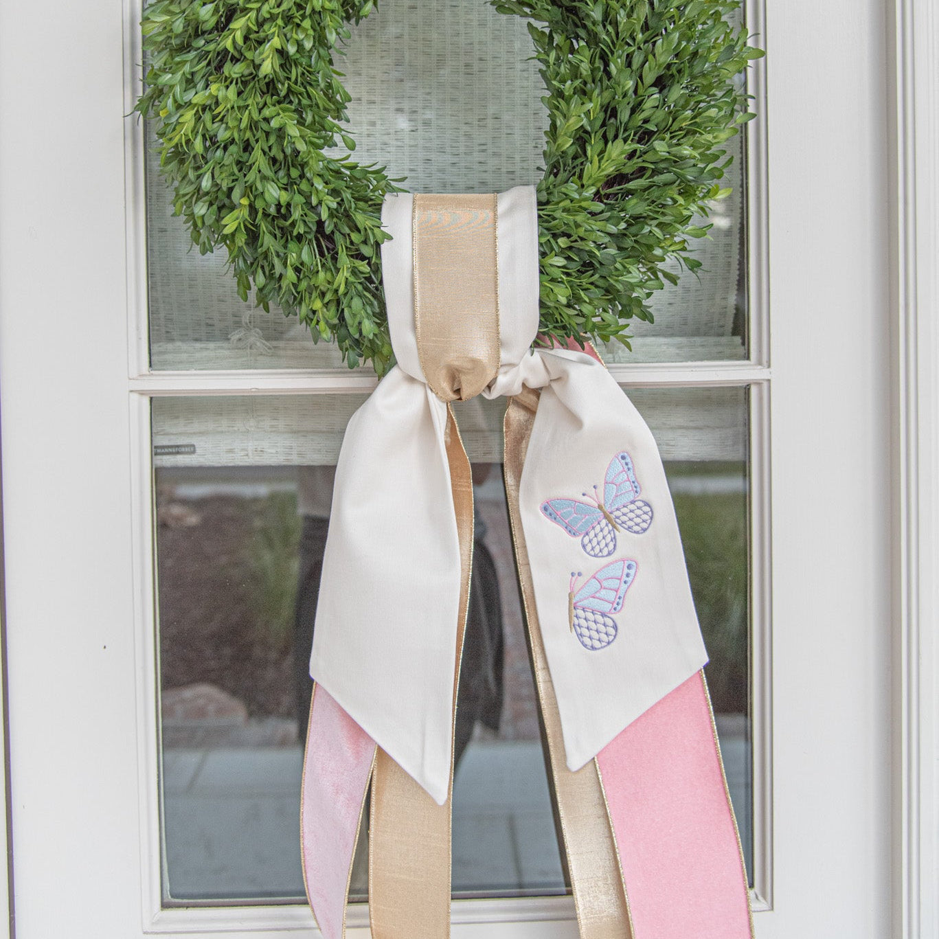 Add a pop of color and whimsy to your front door with a Butterfly Wreath Sash. Embroidered with pastel butterflies, this sash is the perfect accessory to adorn your front door through spring and summer.