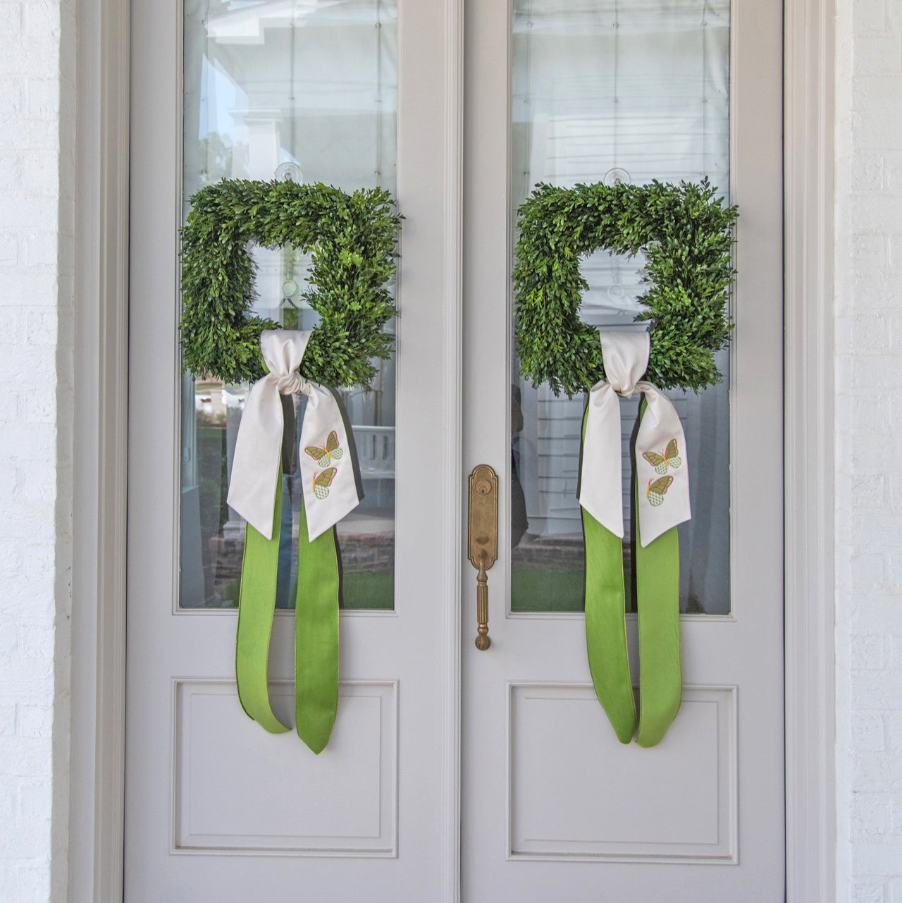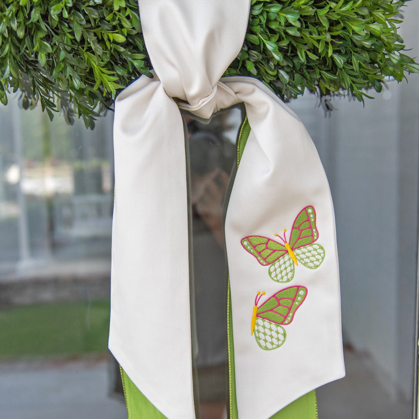 Add a pop of color and whimsy to your front door with a Butterfly Wreath Sash. Embroidered with pastel butterflies, this sash is the perfect accessory to adorn your front door through spring and summer.