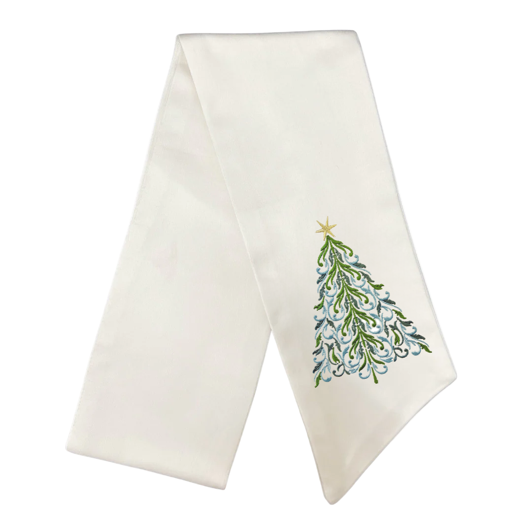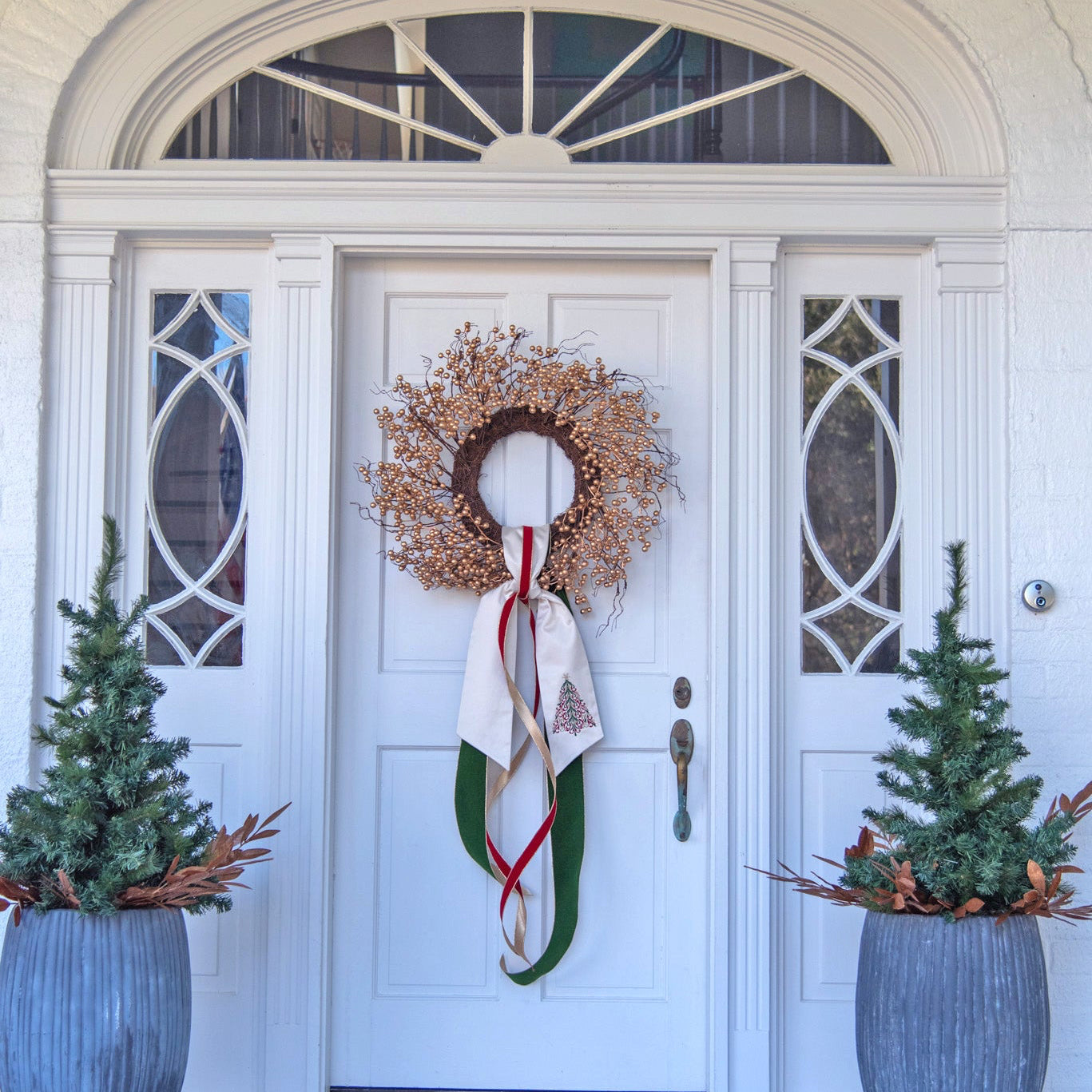 Celebrate the season with our beautiful Christmas Tree Wreath Sash. Featuring a classic evergreen and peacock blue tree design, this sash ties neatly onto your favorite wreath for an elegant holiday accent. Perfect for dressing up front doors or seasonal displays, it adds a timeless Christmas touch to your home décor all winter long.