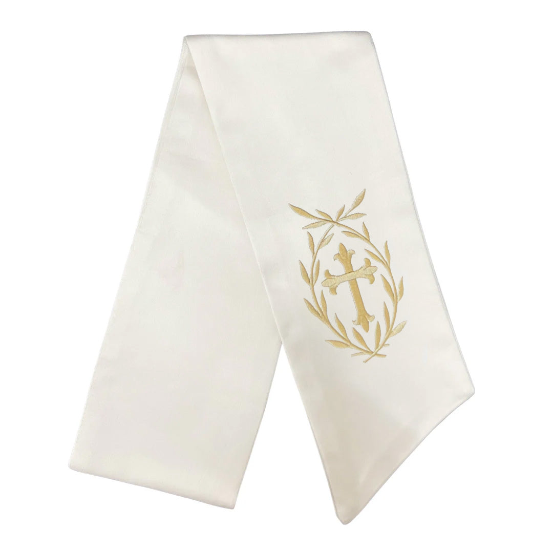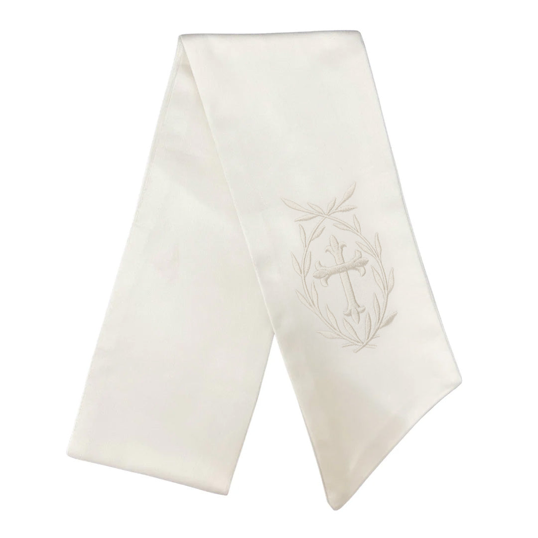 Adding a spiritual element to our signature wreath sash collection, the Cross Wreath Sash features a tone-on-tone, gold or gold & green embroidered cross embellished with a laurel wreath. Designed to celebrate special religious occasions, this sash is a gorgeous addition to a wreath for weddings, baptisms, first communions, and all other religious holidays.