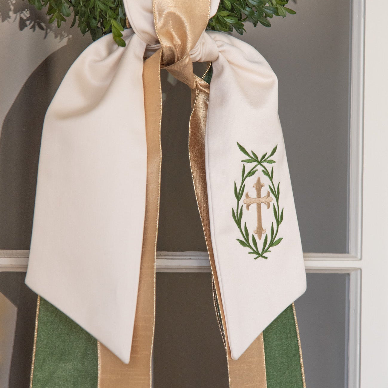 Adding a spiritual element to our signature wreath sash collection, the Cross Wreath Sash features a tone-on-tone, gold or gold & green embroidered cross embellished with a laurel wreath. Designed to celebrate special religious occasions, this sash is a gorgeous addition to  a wreath for weddings, baptisms, first communions, and all other religious holidays.