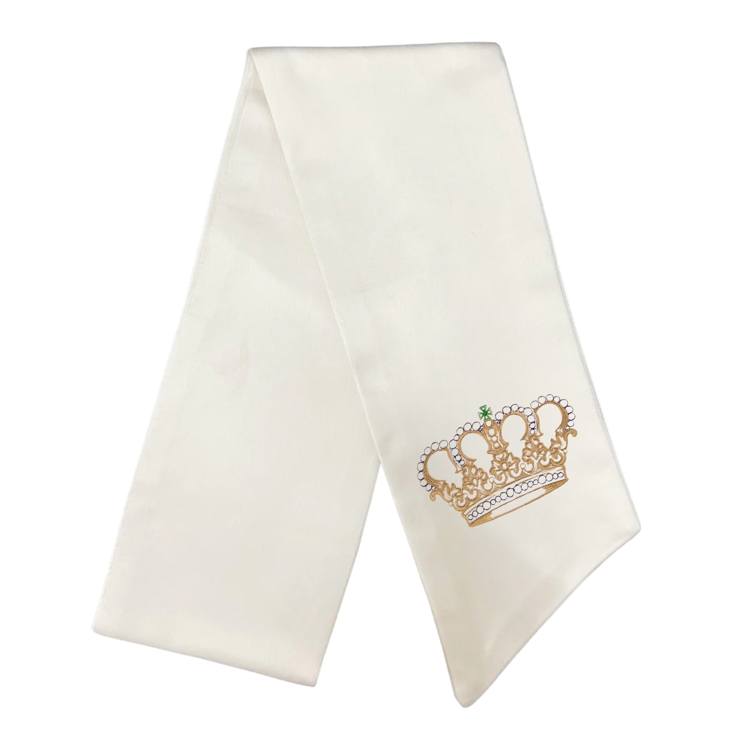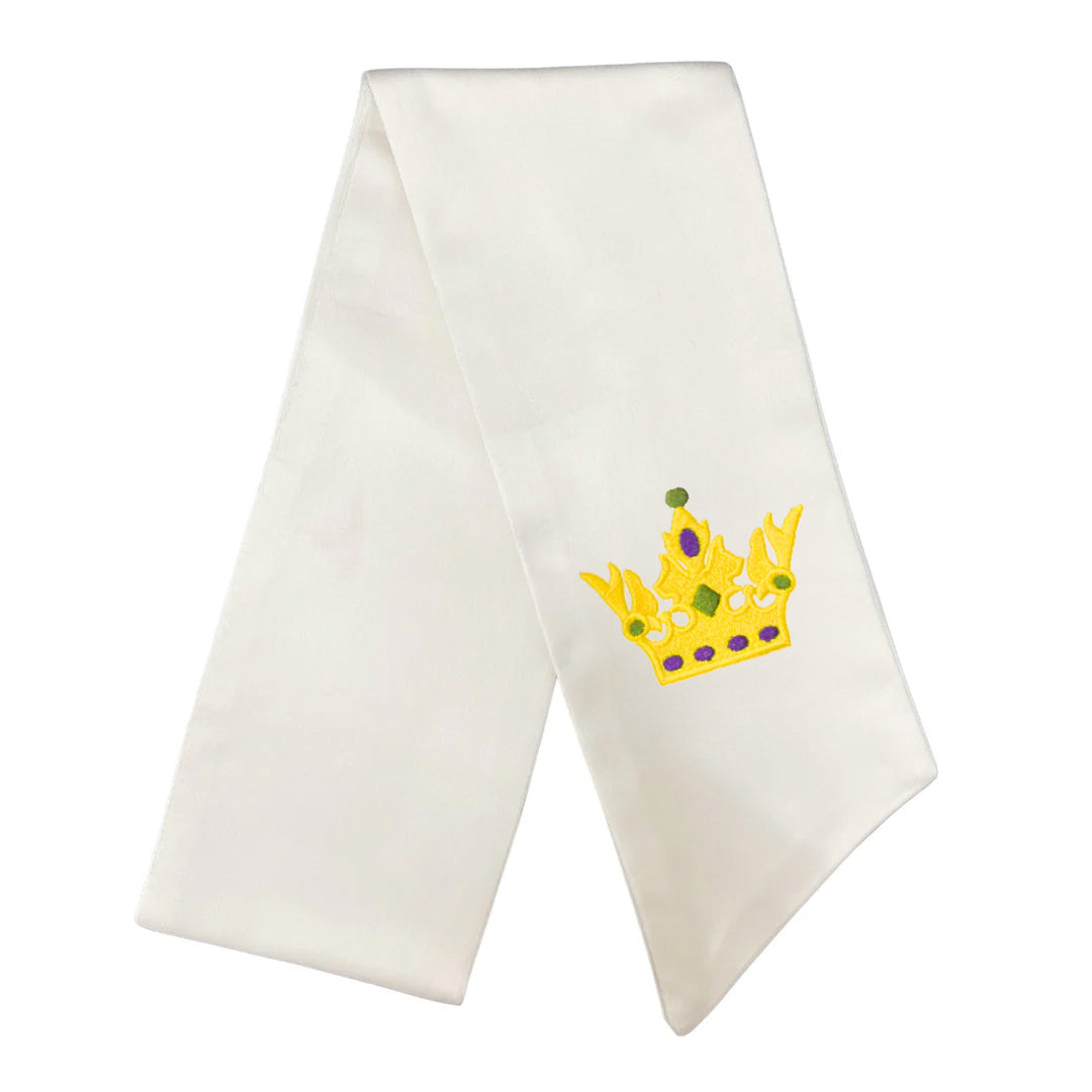 Celebrate the Carnival Season in style- now with THREE styles! We have added a King's Crown along with our festive Mardi Gras mask to our Mardi Gras Wreath Sash collection. Both Crown and Mask are embroidered in classic Mardi Gras gold, purple and green on our standard wreath sash or larger sized wreath sash. Larger Wreath Sashes are in stock now and will ship out faster than our standard wreath sashes- those have a 1-2 week lead time.